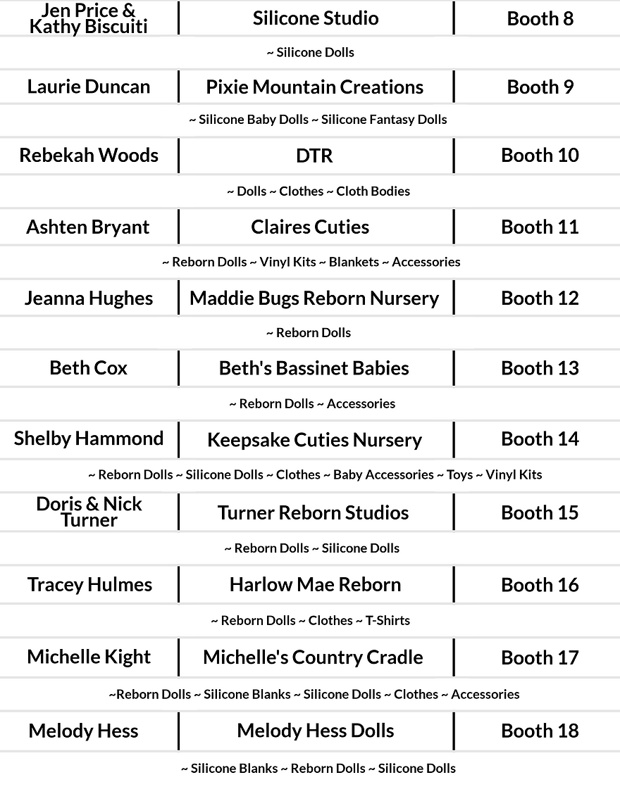 Whether you're attending to shop, connect, or simply experience the artistry, we invite you to browse the list below and get to know the incredible talent that will be featured at the show. Every name here represents hours of hard work, creativity, and love for the doll community.